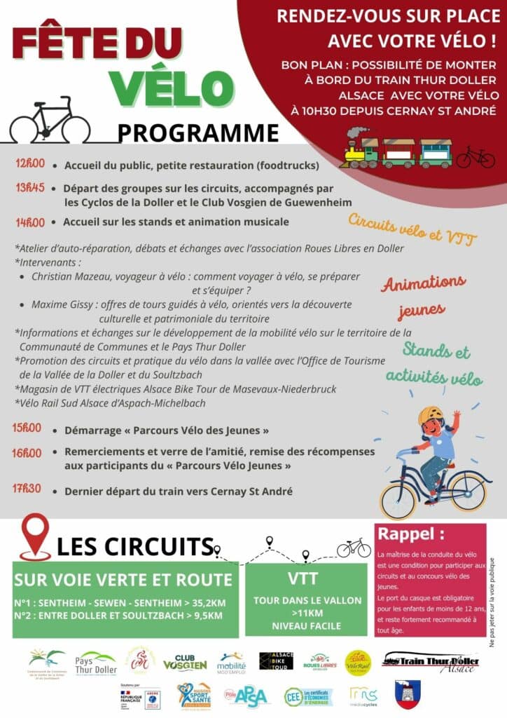 Nous avons le plaisir de vous annoncer que nous participerons à la fête du vélo à Sentheim le dimanche 10 septembre de 12h à 18h. Cet événement est une belle opportunité de vous faire connaître nos services cycles et de rencontrer les acteurs locaux qui œuvrent pour la mobilité douce.